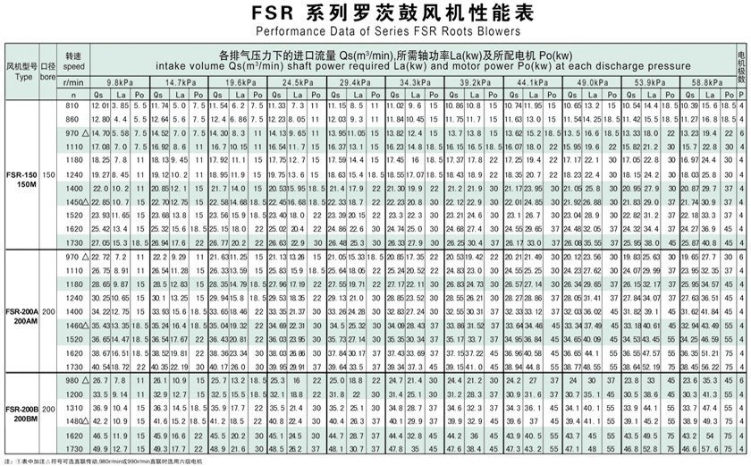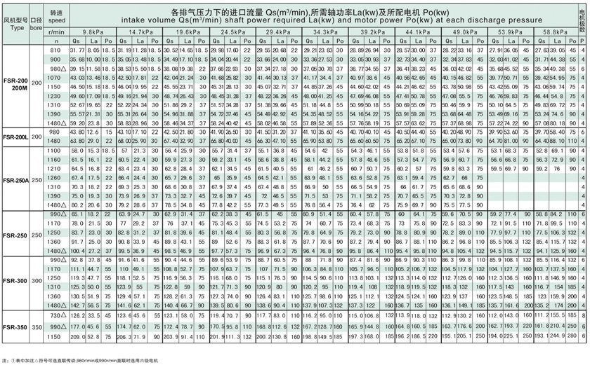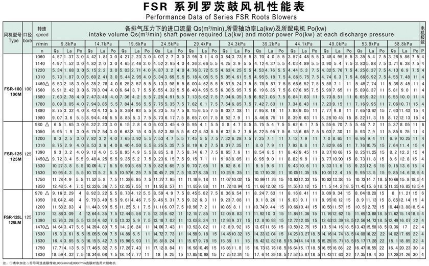 豐源機械羅茨鼓風(fēng)機選型參數(shù)表: